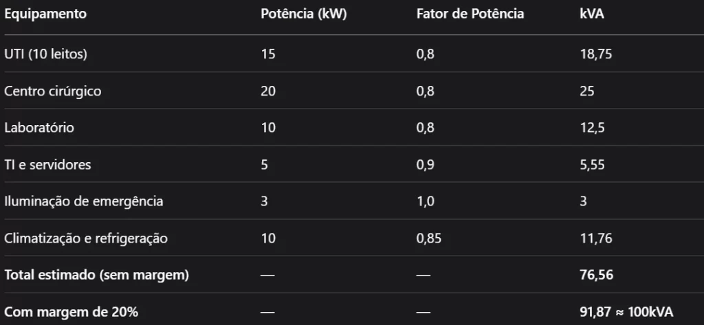Um centro cirúrgico com carga total de 40kW e FP de 0,8 → kVA = 40 / 0,8 = 50kVA